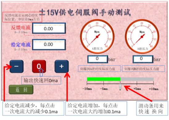6、伺服閥正常時的表現為:a、給定電流0ma時,反饋電流在0ma,伺服閥輸出的A、B腔壓力相同;b、用滑動條可迅速換向,反饋電流改變且A、B腔壓力差較大;c、點擊增加按鈕,反饋電流逐漸增加且A、B腔壓力差逐漸增大;d、點擊減少按鈕,反饋電流逐漸減少且A、B腔壓力差逐漸減少,過0ma后伺服閥會換向;